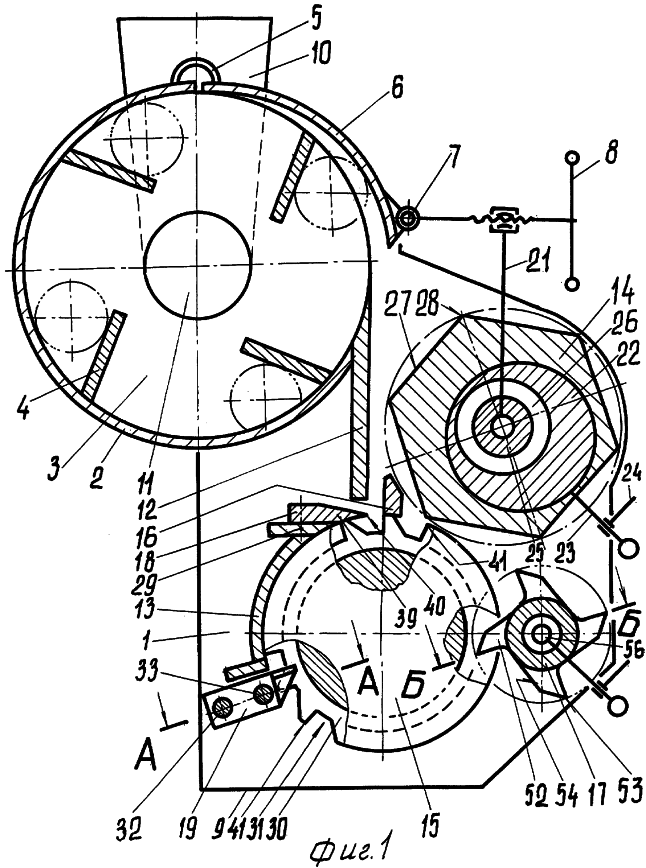 Ножевой барабан 15 смонтирован в полости блока 13 ножей. Последний закреплен болтами 51 на основании 1.