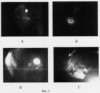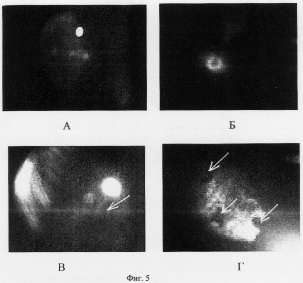 На кроликах породы шиншилла была получена модель субретинальной неоваскулярной мембраны (СНМ). Для создания модели под общей анестезией проводилась лазерная коагуляция центральной области глазного дна (диаметр коагулята 0,2 мм, мощность аргонового лазера 550-850 мВт, время экспозиции 0,15 сек, количество коагулятов – 5). На фиг.5А показано глазное дно кролика сразу после проведения лазерной коагуляции. Стрелками отмечены свежие лазерные коагуляты с перифокальным отеком. На месте трех коагулятов в течение 5 дней формировалась локальная отслойка пигментного эпителия с последующим образованием фиброваскулярной ткани (подтверждено офтальмоскопически и результатами флуоресцентной ангиографии с флуоресцеином натрия). В ушную вену кролика ввели 0,3 мг/кг фотосенсибилизатора на основе композиции производных ди-, три- и тетра-сульфофталоцианинов оксиалюминия с массовьм соотношением 20:60:20. На третьи сутки после введения препарата проведено флуоресцентное исследование глазного дна в спектральном диапазоне 690-730 нм с использованием предлагаемого устройства с плотностью мощности лазерного излучения 50 мВт/см2 и длиной волны 669 нм. Отмечается высокий уровень флуоресценции в области лазерных коагулятов, а именно в зонах перифокального отека и локальных отслоек пигментного эпителия (фиг.5Б). В диске зрительного нерва флуоресценция сосудов не отмечена. ФДТ субретинальной неоваскулярной мембраны осуществлялась посредством воздействия лазерного излучения с длиной волны 669 нм при плотности мощности 500 мВт/см2 в течение 100 сек. Через 3 суток после ФДТ наблюдается (фиг.5Г) гипофлуоресценция патологического очага, свидетельствующая о запустевании СНМ. Спустя 3 недели на этом месте образуется атрофический очаг (рубец), что указывает на эффективность ФДТ в лечении СНМ.