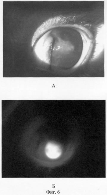 На кроликах породы шиншилла создана модель новообразованных сосудов роговицы путем травматического повреждения эпителия и стромы роговицы. В течение двух недель в центральной зоне роговицы кролика сформировался очаг округлой формы с нечеткими границами: диаметр 8 мм, глубиной 2/3 стромы. В очаге имеются новообразованные сосуды, питающий сосуд идет от лимба “на 10 часах”. В зоне прохождения новообразованных сосудов наблюдаются помутнение стромы и дефекты эпителия (фиг.6А). В ушную вену кролика был введен раствор фотосенсибилизатора на основе композиции производных ди-, три- и тетра-сульфофталоцианинов оксиалюминия в концентрации 0,1 мг/кг. Через 2 суток после введения фотосенсибилизатора на предлагаемом устройстве было проведено исследование флуоресценции в спектральном диапазоне 690-730 нм при облучении лазерным излучением с длиной волны 669 нм и плотностью мощности 10 мВт/см2 в пятне диаметром 1000 мкм. Новообразованные сосуды роговицы интенсивно флуоресцировали (фиг.6Б). При этом флуоресценция сосудов конъюнктивы и радужки глаза не наблюдалась, следовательно, концентрация препарата в них была невысокой, а риск их фотодинамического повреждения – минимальный. После флуоресцентной ангиографии была проведена ФДТ. Для этого патологический участок облучался лазерным излучением с длиной волны 669 нм и плотностью мощности 500 мВт/см2 в течение 100 сек, диаметр светового пятна составлял 1000 микрон. На вторые сутки после проведения ФДТ было отмечено запустевание сосудистой сети, что свидетельствует об эффективности ФДТ в лечении неоваскуляризации роговицы.