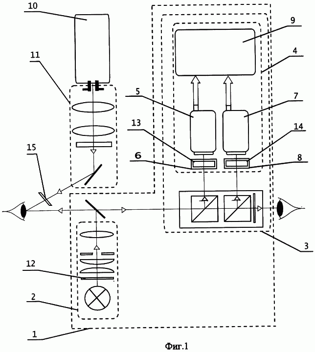 Предлагаемое устройство работает следующим образом. В диагностическом режиме осветитель 2 офтальмологического прибора 1 облучает глаз пациента, цветная видеокамера 5 регистрирует рассеянное от нее излучение, сигнал с цветной видеокамеры поступает в систему отображения видеоинформации 9, где и наблюдается цветное изображение исследуемого участка глаза пациента. При этом излучение осветителя офтальмологического прибора благодаря наличию в нем фильтра 12 не содержит компоненты с длиной волны, превышающей 640 нм, однако эта длинноволновая компонента излучения и не участвует в формировании цветного излучения цветной видеокамеры. Одновременно выходящее из лазера 10 излучение проходит адаптер 11, затем гомогенизирующий элемент-расширитель пучка 15 и облучает широким однородным пучком глаз пациента, вызывая флуоресценцию фотосенсибилизатора. Излучение флуоресценции через микроскоп 3 попадает в видеоканал 4 и через систему 8 оптического переноса изображения, содержащую фильтр 14, поступает на высокочувствительную видеокамеру 7. Через этот фильтр проходит и поступает на высокочувствительную видеокамеру 7 только излучение флуоресценции. Ни рассеянное от глаза лазерное излучение, ни излучение посторонней засветки (включая излучение осветителя 2 офтальмологического прибора 1) через фильтр 14 практически не поступает (тем более что благодаря наличию в осветителе 2 фильтра 12 излучение осветителя практически не содержит компоненты, лежащей в спектральном диапазоне флуоресценции фотосенсибилизатора). В то же время благодаря наличию в системе 6 оптического переноса изображения исследуемого участка глаза на цветную видеокамеру 5 фильтра 13 с параметрами согласно предлагаемому изобретению рассеянное от глаза лазерное излучение широкого однородного лазерного пучка оказывается практически незаметным в цветной видеокамере 5 (не влияя ни на яркость, ни на цвет изображения исследуемого участка глаза пациента). Благодаря этому цветная видеокамера формирует в видеоканале цветное изображение исследуемого участка глаза пациента, а высокочувствительная видеокамера – флуоресцентное изображение данного участка, распределение яркости в котором соответствует распределению фотосенсибилизатора в тканях и сосудах глаза. Сопоставляя эти два изображения на экране системы 9 отображения видеоинформации, офтальмолог делает вывод о наличии патологических изменений на исследуемом участке глаза, их топографии, размерах, и в соответствии с ним перемещает манипулятором офтальмологический прибор для выбора места фокусировки лазерного излучения в терапевтическом режиме и регулирует параметры адаптера.