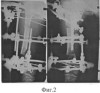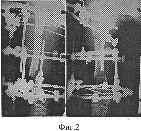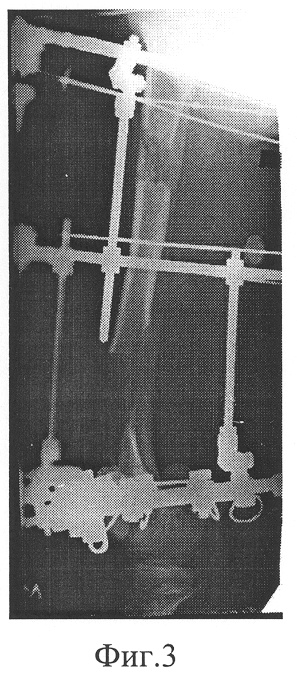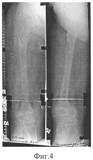 В послеоперационном периоде, начиная с 5-7 дня, производили дозированное продольное перемещение выделенных фрагментов обеих бедер. После появления рентгенологических признаков формирования костного регенерата в зонах дистракции – на 10 день – промежуточные фрагменты дозированно, в течение 5-ти дней, угловым разворотом средних опор отклонили от продольной оси сегментов на 15 градусов (фиг.2). При этом положение проксимального и дистального фрагментов оставили неизменным. Сохраняя приданное положение промежуточных фрагментов, продолжали продольную дистракцию до восстановления длины сегментов. Темп перемещения варьировали в пределах 0,5-1,0 мм в сутки на каждом из уровней дистракции, общая продолжительность которой составила 57 дней. Срок последующей фиксации в аппарате – 39 дней (фиг.3, 4). После демонтажа аппарата дополнительной иммобилизации конечности не производилось; больная прошла курс ЛФК.
