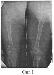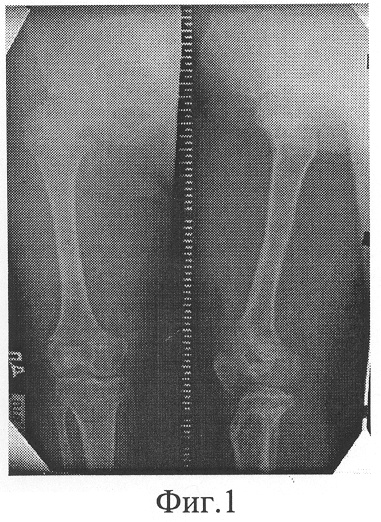 Больная М.,13 лет, поступила в клинику с диагнозом: Ахондроплазия, низкий рост (фиг.1). Для увеличения размеров конечностей больной выполнена операция: двойные остеотомии бедер, остеосинтез аппаратом внешней фиксации.