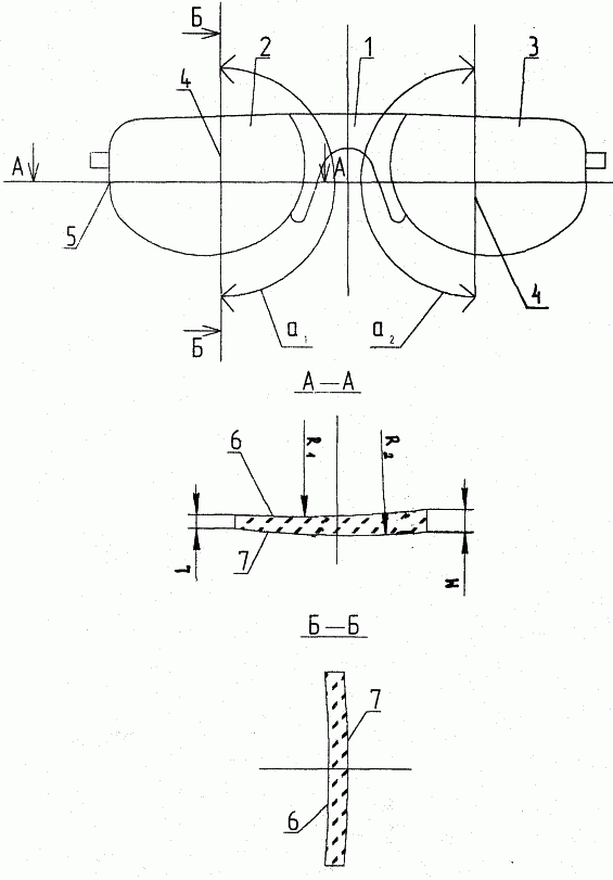 Линзы 2, 3 закрепляются в рамке оправы 1. Метками 4 на линзах 2, 3 обозначена вертикальная оптическая ось, меткой 5 – горизонтальная оптическая ось. Линзы 2, 3 в разрезе имеют плоскую или вогнутую сферическую внутреннюю 6 и выпуклую сферическую внешнюю 7 поверхность (сечения А-А, Б-Б); торец L, обращенный к ушным дужкам, меньше по толщине торца М, обращенного к носовым опорам. Кривизна поверхностей R1 и R2, толщина линз 2, 3 зависят от заданной формулы и коэффициента преломления, избранного для изготовления линз материала.
