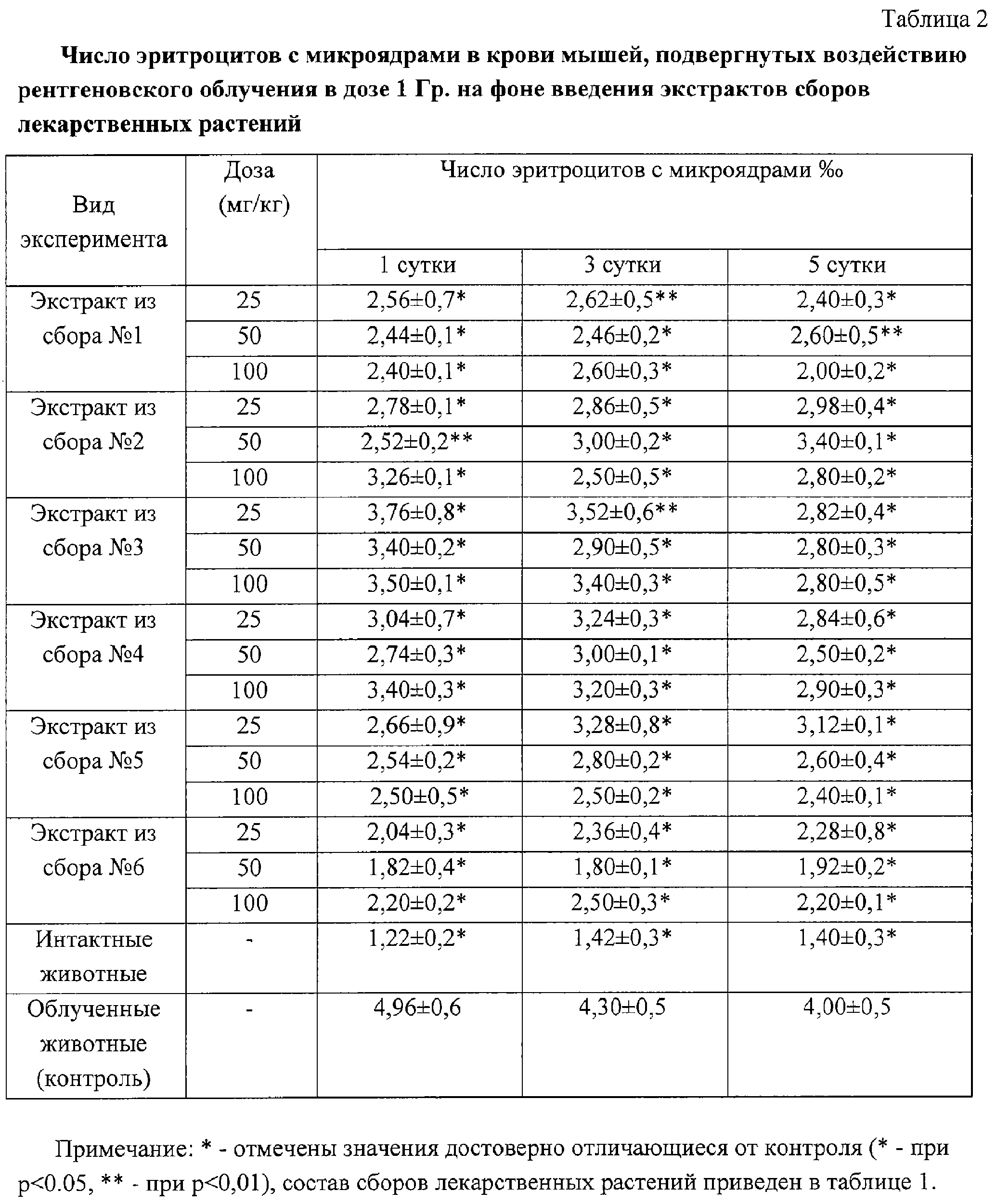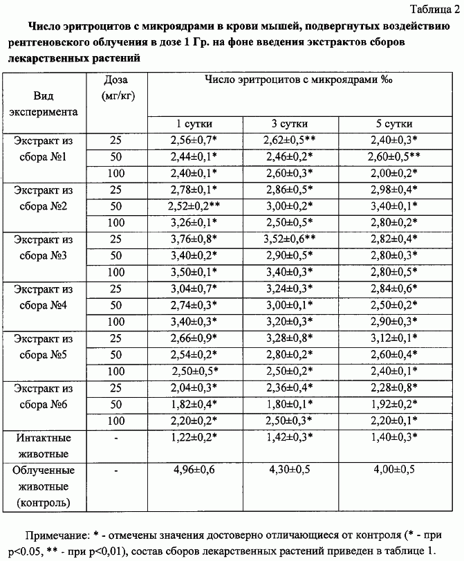 Изобретение относится к области фармации, фармакогнозии, к лекарственным средствам, обладающим антимутагенным действием, и может быть использовано для снижения негативных последствий действия ионизирующей радиации, а также химических мутагенов. Известны лекарственные препараты, обладающие аналогичным действием: – растительного происхождения: водный и этанольный экстракты дудника лекарственного, водный экстракт крапивы двудомной, экстракт чеснока, масло облепихи крушиновидной, суспензионная культура женьшеня, экстракт радиолы розовой, экстракт элеутерококка колючего, экстракт на 70%-ном этаноле из фейхоа, экстракт шалфея лекарственного, глицирам, байкалинат-L-лизин, байкалинат-L-гистидин, экстракт полыни горькой [1, 2, 3, 4, 5, 6, 7]. – полученные путем химического синтеза: цистофос, гаммафос, гумизол, димеркапрол, маннитол, томерзол, аспартам, новобиоцин, циклогексимид, пуромицин, празиквантель, ксимедон, йодантипирин, полигуацил, амиксин, ридостин, натрия оксибутират, лацидипин, бемитил, кофеин-бензоат натрия, аденозин, парааминобензойная кислота, токоферола ацетат, афобазол, аскорбилпальмитат, индометацин, бутилокситолуол, хлорамфеникол [8, 9, 10, 11, 12, 13, 14, 15]. Одним из наиболее изученных в указанном отношении препаратов является йодантипирин, чей антимутагенный эффект в суммарной дозе 450 мг/кг превышает антимутагенное действие байкалинат-лизина (50 мг/кг), глицирама (50 мг/кг), ридостина (5 мг/кг), натрия оксибутирата (200 мг/кг), однако его применение может сопровождаться побочными реакциями, наличием противопоказаний к применению [15]. Наиболее близким к предлагаемому является лекарственное средство, содержащее водный экстракт из листьев крапивы двудомной [1]. Однако область его применения ограничена в связи с тем, что этот препарат оказывает антимутагенное действие не на все звенья мутагенеза, что, возможно, обусловлено недостаточным количеством входящих в него биологически активных веществ. В связи с этим имеется настоятельная необходимость в создании эффективного комплексного лекарственного средства, действие которого может быть направлено на все звенья мутагенеза [1, 6]. Таким требованиям могут отвечать средства в виде экстракционных препаратов из сложных лекарственных растительных сборов. Новой технической задачей является расширение арсенала средств из природных источников биологически активных веществ, обладающих антимутагенной активностью. Поставленная задача решается новым лекарственным средством, обладающим антимутагенным действием на основе водного растительного экстракта из листьев крапивы двудомной, причем водный экстракт получен из сырья, в состав которого дополнительно входят цветки календулы лекарственной, семена льна посевного, трава хвоща полевого, корни одуванчика лекарственного, взятые в равном соотношении, вес.ч.: корней одуванчика лекарственного (Radices Taraxaci officinalis) – 10 частей листьев крапивы двудомной (Folia Urticae dioicae) – 10 частей травы хвоща полевого (Herba Equiseti arvensis) – 10 частей цветков календулы лекарственной (Flores Calendulae officinalis) – 10 частей семян льна посевного (Semina Lini Usitatissimi) – 10 частей Лекарственный растительный сбор с характерным запахом представляет собой смесь неоднородных частиц диаметром менее 6 мм (кусочков листьев, черешков, стеблей, ветвей, цветков, корней, семян) светло-зеленого, темно-зел
