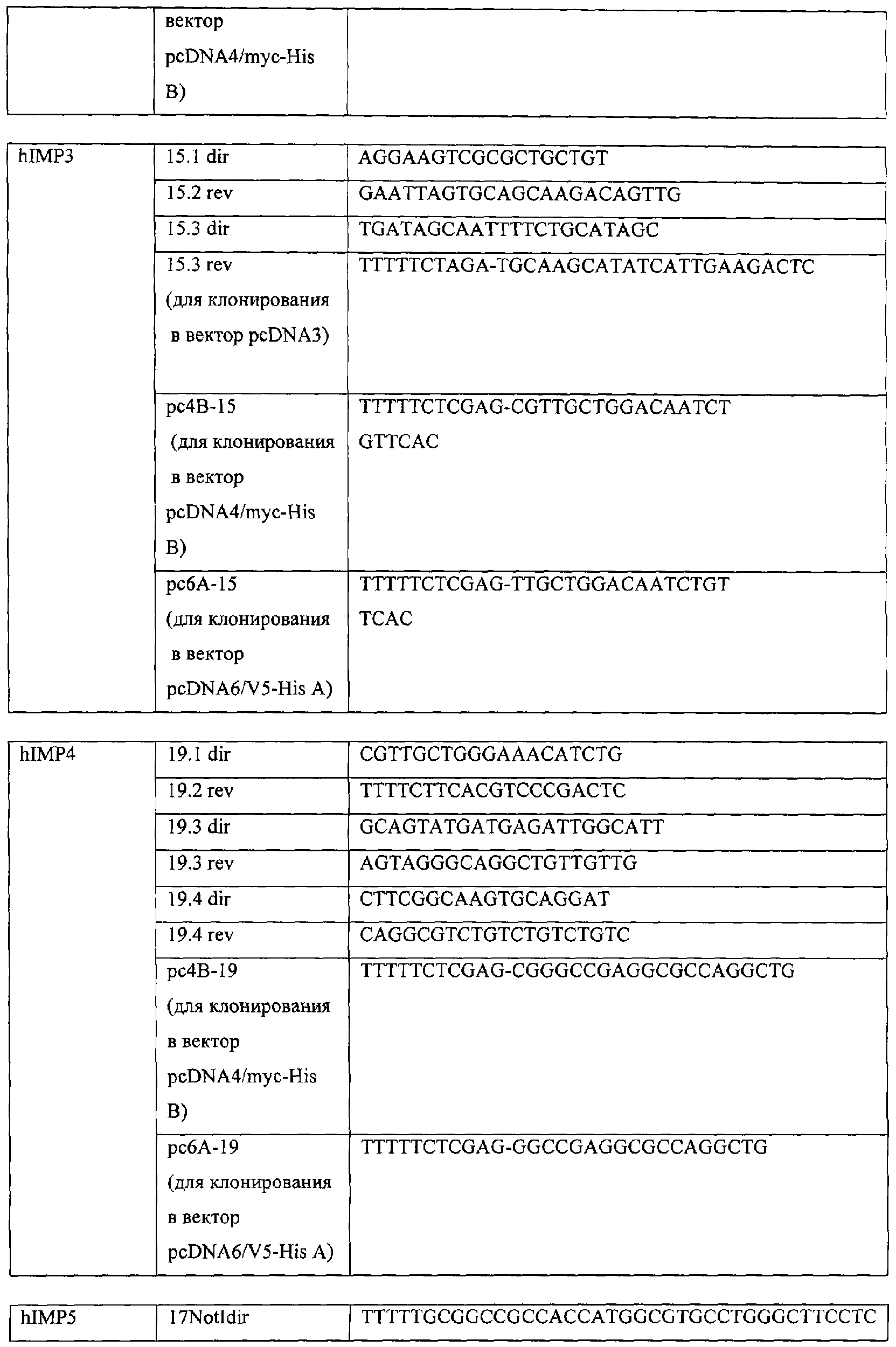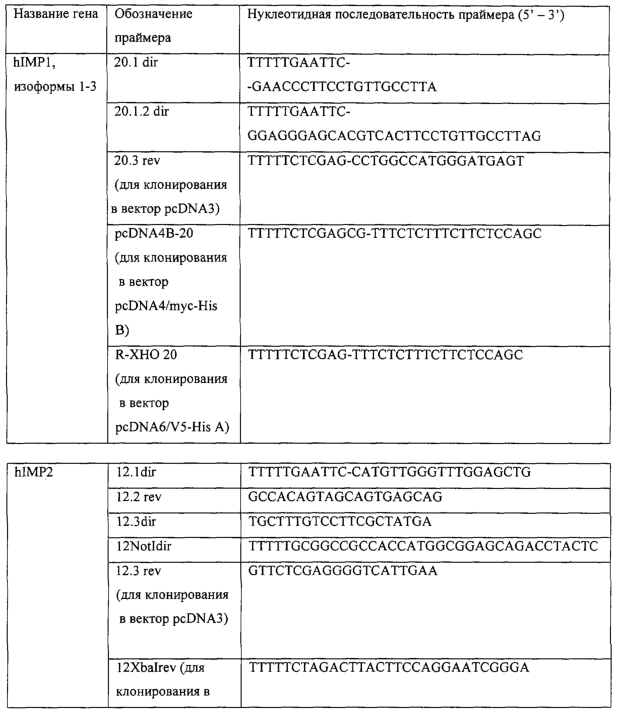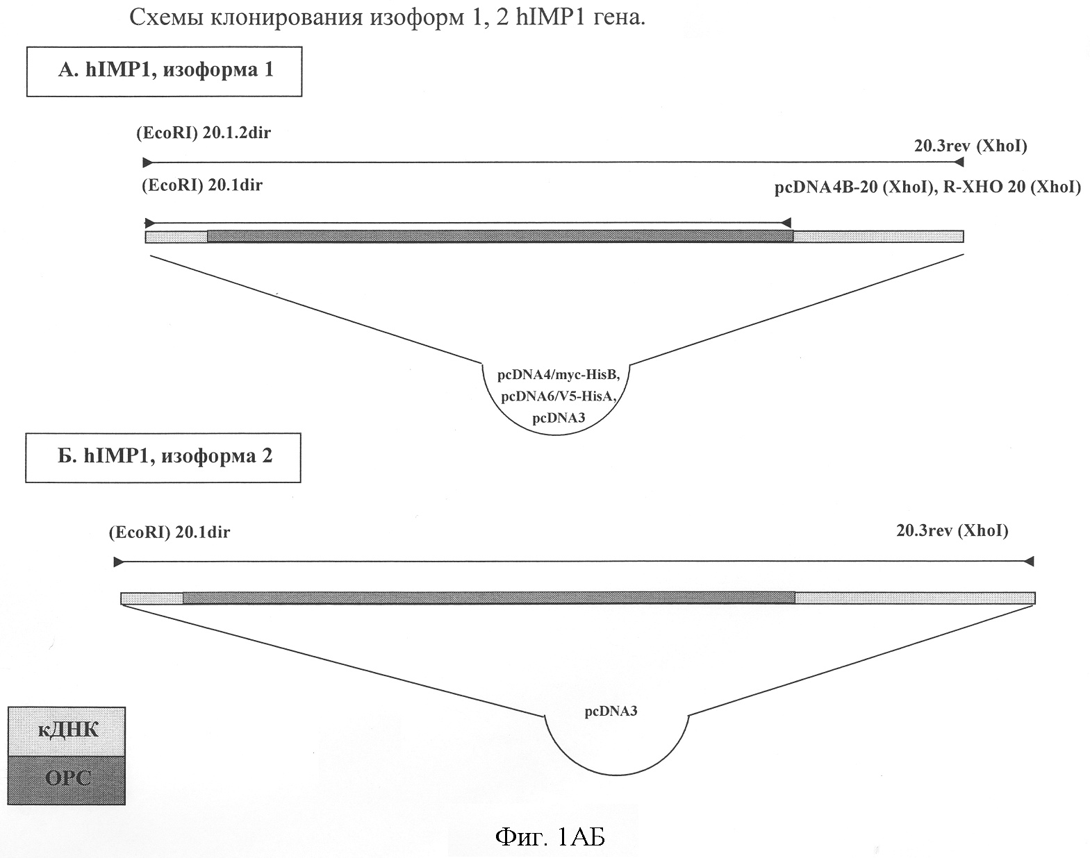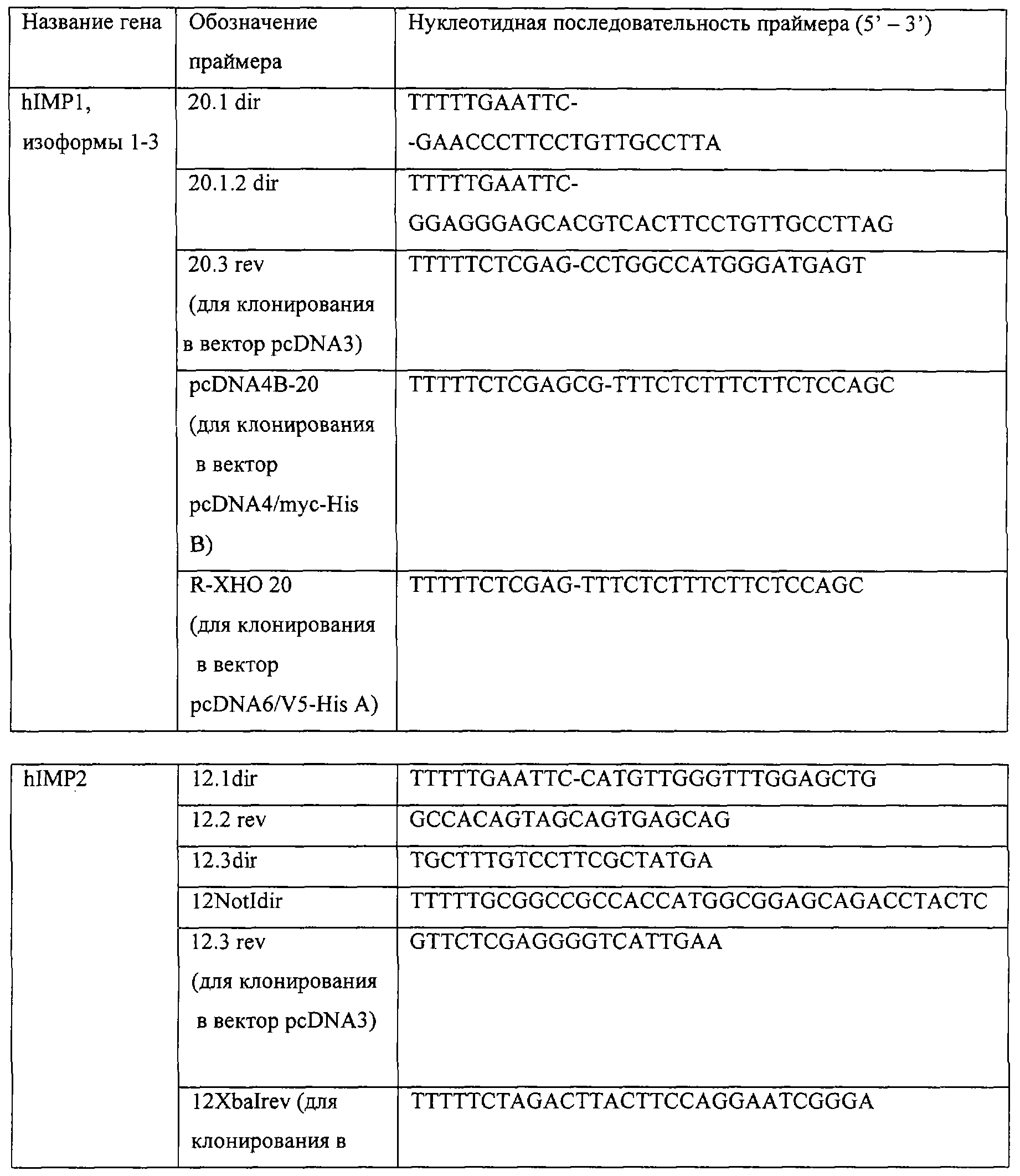 Нуклеотидные последовательности альтернативных транскриптов гена hIМР1 (изоформы 1-3) определяли с помощью секвенирования клонированных ОТ-ПЦР продуктов из гиппокампа человека (Clontech, кДНК). ПЦР-продукты для клонирования полноразмерных копий кДНК генов hIMP2-hIMP4 человека получали из кДНК крови человека. Для клонирования гена hIMP5 использовали геномную ДНК человека.