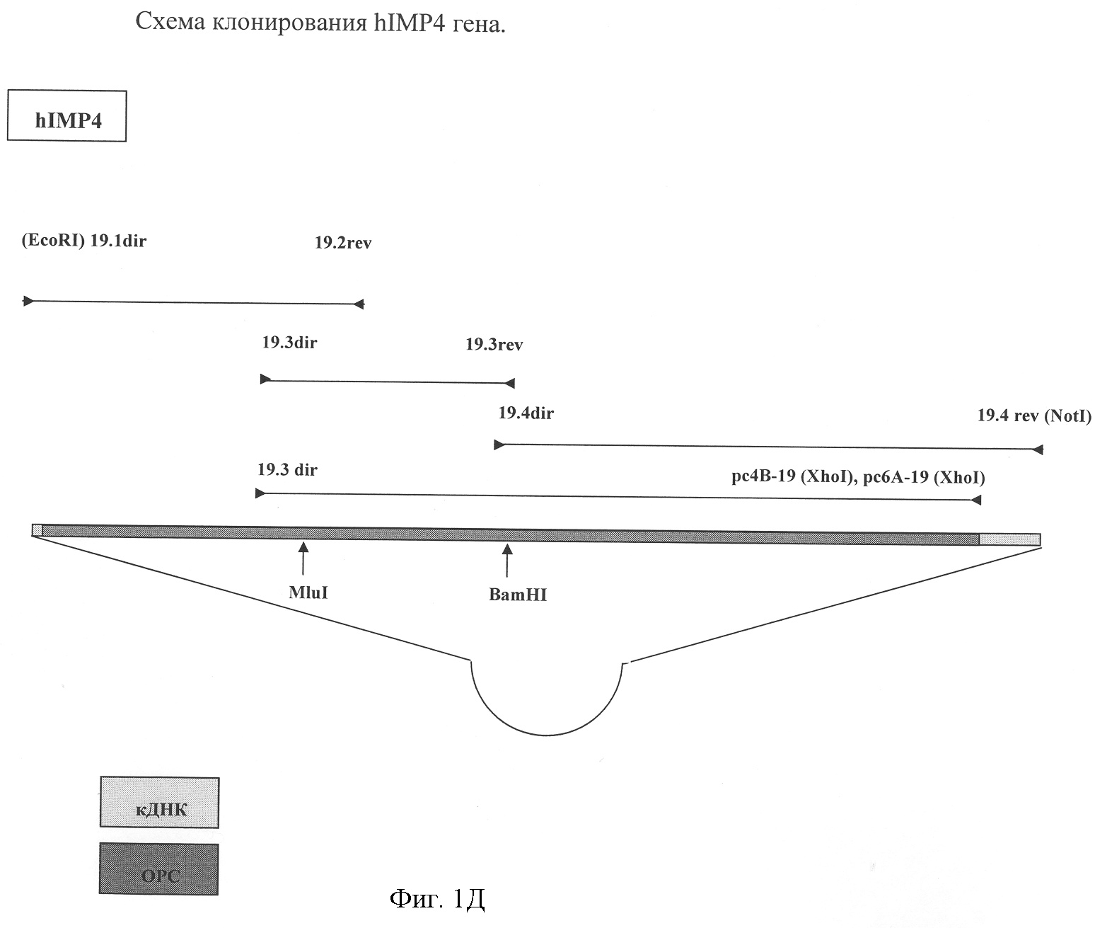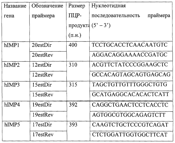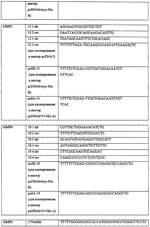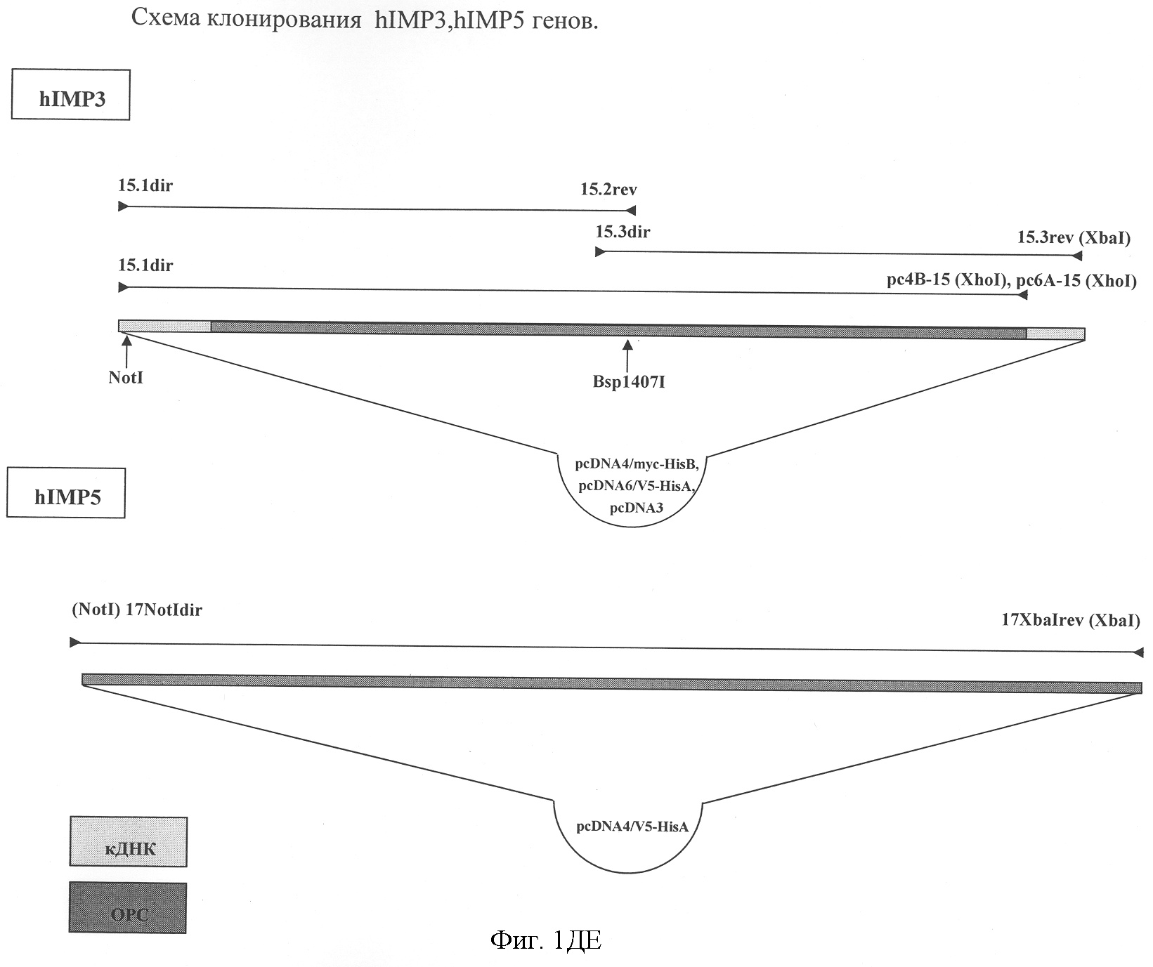 Нуклеотидные последовательности альтернативных транскриптов гена hIМР1 (изоформы 1-3) определяли с помощью секвенирования клонированных ОТ-ПЦР продуктов из гиппокампа человека (Clontech, кДНК). ПЦР-продукты для клонирования полноразмерных копий кДНК генов hIMP2-hIMP4 человека получали из кДНК крови человека. Для клонирования гена hIMP5 использовали геномную ДНК человека.