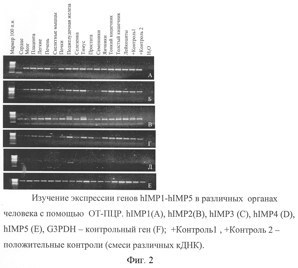 Показана широкая представленность полиА+РНК hIМР1-hIМР4 в разных тканях человека, повышенная экспрессия в поджелудочной железе и пониженная в мышцах и тканях сердца по сравнению с клетками мозга и другими тканями (фиг.2).