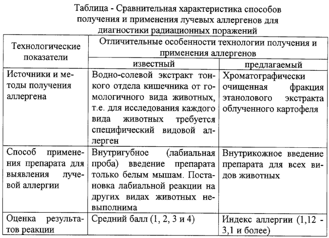 1. Способ получения аллергенного препарата для диагностики радиационных поражений организма, включающий извлечение из облученных в дозе 350-400 Гр клубней картофеля хиноидного радиотоксина путем этанолового экстрагирования, удаления экстрагента на ротационном испарителе, подкисления осадка соляной кислотой до рН 7,2 и дополнительного экстрагирования этилацетатом, отличающийся тем, что полученную этилацетатную фракцию подвергают хроматографической очистке путем нанесения вышеуказанной фракции на хроматографическую бумагу (20×20 см) и разгоняют в системе: а) 2%-ная уксусная кислота; б) смесь бензол – уксусная кислота – вода в соотношении 2:4:1 соответственно; полученную специфическую аллергенную фракцию из хроматограммы элюируют 2%-ным раствором уксусной кислоты, а конечный продукт стандартизируют по сухому веществу из расчета 1 мг/см3. 2. Способ диагностики радиационных поражений организма, включающий внутрикожное введение специфического аллергена и выявление аутосенсибилизации, отличающийся тем, что в качестве специфического аллергена животным вводят очищенную фракцию растительного хиноидного радиотоксина в объеме 0,1-0,2 см3 (1,5-2,0 мкг на животное) в область внутренней поверхности бедра (у овец и коз), в верхней трети спины (у крупного рогатого скота и лошадей) и тыльной стороне у основания уха (свиней), а выявление аутосенсибилизации устанавливают по реакции организма (кожи) на месте инъекции аллергена через 24, 48, 72, 96, 120, 144 ч после облучения и по индексу аллергии (ИА), равному или превышающему 1,12 (ИА