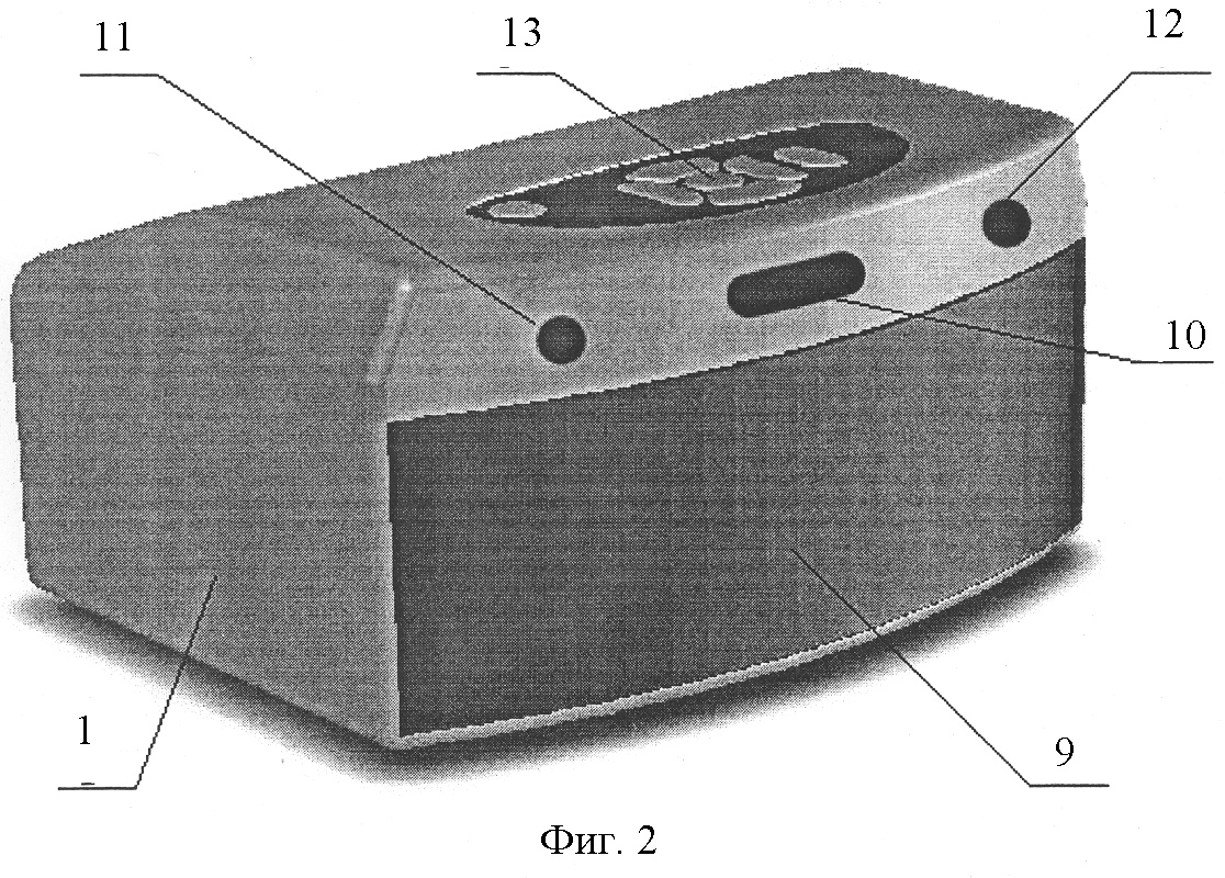 Устройство состоит из корпуса, внутри которого установлены печатные платы с электронными компонентами. Электронная часть изделия показана на блок-схеме на фиг.1 и включает блок управления 1, соединенные с ним таймер 2, блок ввода данных о времени засыпания, о параметрах световых и звуковых сигналов 3, источник световых сигналов 4, блоки декодирования 5 и воспроизведения 6 музыкальных произведений, соединенные с блоком управления. Дополнительно, устройство содержит блок хранения музыкальных произведений 7 и блок пробуждения 8. Внешний вид устройства показан на фиг.2. На передней панели расположены: источник звука 9, окно 10 светового излучателя, окно 12 приемника сигнала дистанционного управления и окно 12 четырехразрядного люминесцентного индикатора. На верхней плоскости корпуса расположены кнопки управления прибором 13.