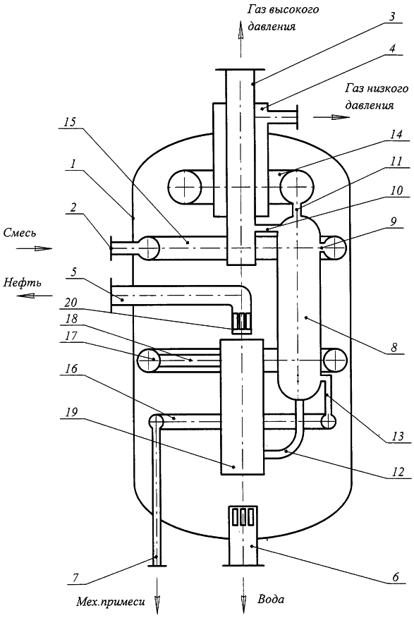 Многофазный сепаратор представляет собой вертикальный цилиндрический корпус 1 с патрубком 2 ввода многофазной смеси, например нефтегазовой смеси, патрубками 3 и 4 для вывода газа высокого и низкого давления, патрубком 5 для вывода нефти, патрубком 6 для вывода воды, патрубком 7 для вывода механических примесей. Внутри корпуса 1 установлен, по меньшей мере, один вертикальный центробежный модульный сепаратор 8, снабженный патрубками 9, 10, 11, 12, 13 для ввода разделяемой смеси и вывода газа, нефти, воды и механических примесей, соответственно. Выше модульного сепаратора 8 установлен торообразный разбрызгиватель 14 нефти с тангенциальными соплами (не показано), сообщенный с патрубком 11 вывода нефти из модульного сепаратора, а ниже разбрызгивателя 14 – соединенная с патрубком 2 ввода многофазной смеси торообразная гребенка 15, сообщенная с патрубком 9 ввода разделяемой смеси в модульный сепаратор. В нижней части сепаратора установлен торообразный сборник 16, соединенный с патрубком 13 для вывода механических примесей из модульного сепаратора и патрубком 7 для вывода механических примесей из корпуса сепаратора. Выше торообразного сборника 16 расположен торообразный распределитель 17 воды, сообщенный посредством радиальных патрубков 18 с соединительной трубой 19 и патрубком 12 для вывода воды из модульного сепаратора. В торообразном распределителе 17 выполнены прорези с лопатками (не показаны) для тангенциального вывода воды. Над торообразным распределителем 17 воды установлено заборное устройство 20, выполненное в виде стакана с отверстиями для забора нефти из корпуса сепаратора, соединенное с патрубком 5 для вывода нефти из корпуса сепаратора.