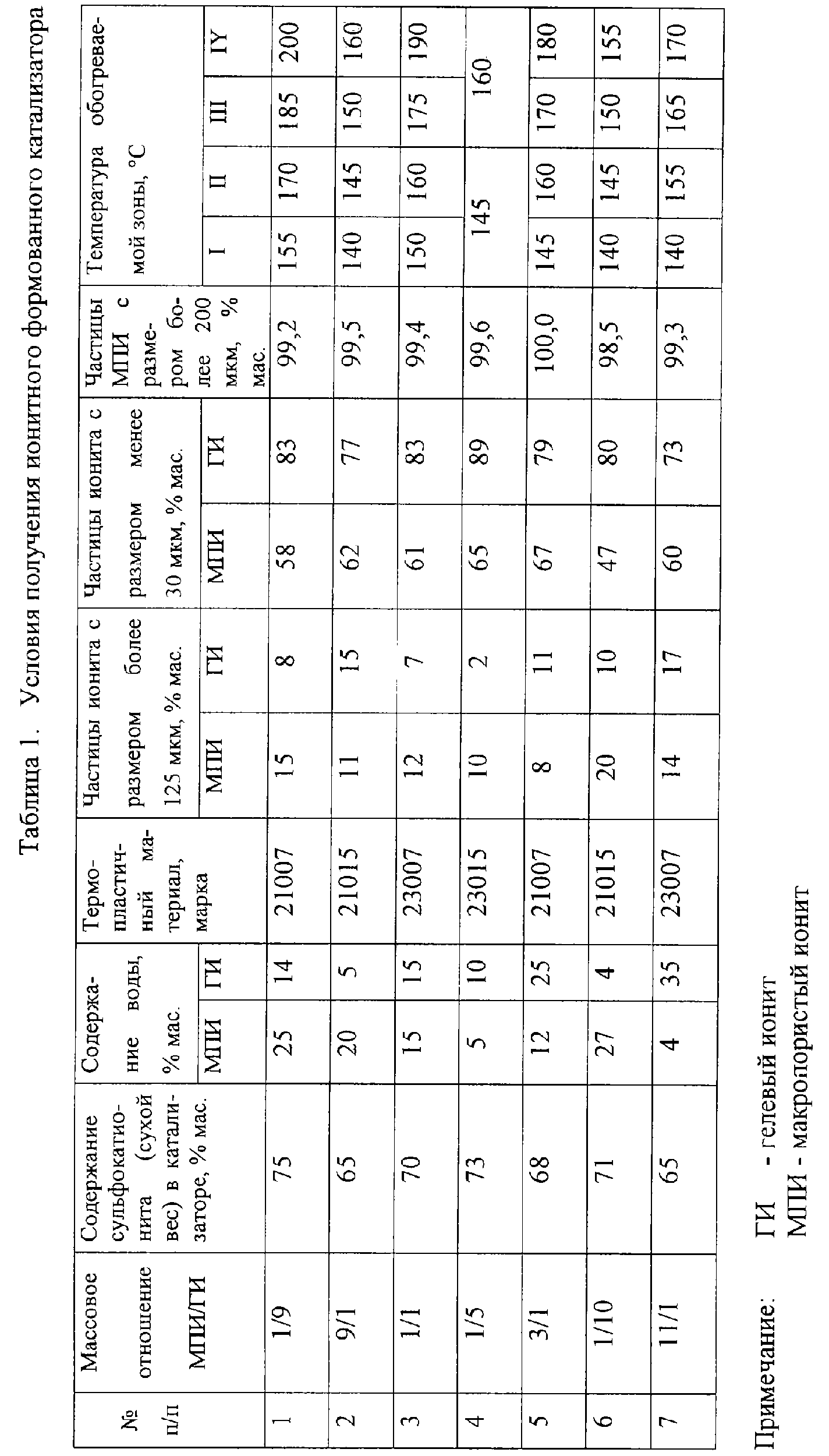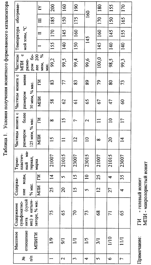 1. Ионитный формованный катализатор, состоящий из сульфированного сополимера стирола и дивинилбензола и термопластичного материала – полимеров пропилена или сополимеров пропилена и этилена, отличающийся тем, что в качестве сульфированного сополимера стирола и дивинилбензола используют смесь порошкообразных сульфированных сополимеров стирола и дивинилбензола макропористой и гелевой структуры. 2. Способ получения ионитного формованного катализатора по п.1 путем смешения сульфированного сополимера стирола и дивинилбензола и термопластичного материала и формования полученной смеси методом экструзии при повышенной температуре материального цилиндра экструдера и формующей головки, отличающийся тем, что формование смеси ведут при температуре материального цилиндра экструдера 140-200°С и температуре формирующей головки, равной температуре в последней обогреваемой зоне материального цилиндра экструдера. 3. Ионитный формованный катализатор по п.1, отличающийся тем, что в качестве сульфированного сополимера стирола и дивинилбензола используют смесь порошкообразных сульфированных сополимеров стирола и дивинилбензола макропористой и гелевой структуры при массовом соотношении (1÷9):(9÷1) в расчете на сухой вес сополимеров. 4. Ионитный формованный катализатор по п.1, отличающийся тем, что в качестве сульфированного сополимера стирола и дивинилбензола используют смесь порошкообразных сульфированных сополимеров стирола и дивинилбензола макропористой и гелевой структуры с содержанием воды 5-25 мас.%. 5. Ионитный формованный катализатор по п.1, отличающийся тем, что в качестве сульфированного сополимера стирола и дивинилбензола макропористой и гелевой структуры используют фракции, содержащие не более 15 мас.% частиц сополимеров в пересчете на сухой продукт с размером более 125 мкм. 6. Ионитный формованный катализатор по п.1, отличающийся тем, что в качестве сульфированного сополимера стирола и дивинилбензола гелевой структуры используют фракции, содержащие не менее 75 мас.% частиц сополимера в пересчете на сухой продукт с размером менее 100 мкм. 7. Ионитный формованный катализатор по п.1, отличающийся тем, что в качестве сульфированного сополимера стирола и дивинилбензола макропористой структуры используют фракции, содержащие не менее 50 мас.% частиц сополимера в пересчете на сухой продукт с размером менее 100 мкм. 8. Ионитный формованный катализатор по п.1, отличающийся тем, что в качестве сульфированного сополимера стирола и дивинилбензола макропористой структуры используют фракции, содержащие не менее 99 мас.% частиц сополимера в пересчете на сухой продукт с размером менее 200 мкм. 9. Способ по п.2, отличающийся тем, что формирование смеси ведут в экструдере, имеющем более двух обогреваемых зон. 10. Способ по п.2, отличающийся тем, что температуру в каждой последующей обогреваемой зоне экструдера поддерживают на 5-15°С больше температуры предыдущей обогреваемой зоны.