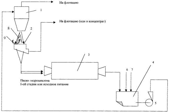 Исходный материал, например доизмельченные пески гидроциклонов, с флотационными реагентами поступают на классификацию пульпы в гидроциклон 1, где они разделяются на слив, направляемый на флотационное разделение на пенный и камерный продукты (флотомашины на чертеже не показаны). Пески гидроциклона 1 поступают на разделение на дополнительные пенный и камерный продукты во флотокамеру 2 из песковой насадки гидроциклона 1, в виде свободной расширяющейся струи непосредственно на поверхность пульпы дополнительной флотокамеры 2. В результате такой подачи песков происходит эффективное струйное аэрирование пульпы в объеме флотокамеры и наиболее полное всплывание недоизвлеченных в гидроциклоне мелких фракций ценного компонента и вывод их в дополнительный пенный продукт, который выделяется в виде самостоятельного концентрата или направляется на флотационное разделение во флотомашины в голову основной флотации или на операцию контрольной флотации. Дополнительный камерный продукт флотокамеры 2 подается в шаровую мельницу 3, где доизмельчается и через зумпф 4 насосом 5 перекачивается в гидроциклон 1 на классификацию.