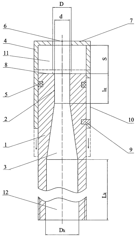 С входом конического участка 3 канала сопла 1 сообщена цилиндрическая камера 12, которая расположена соосно каналу сопла 1. Диаметр Dk цилиндрической камеры 12 равен диаметру входного отверстия конического участка 3. Длина Lk цилиндрической камеры 12 составляет 10DK в соответствии с диапазоном оптимальных значений Lk: 5Dк Lк 20Dк.