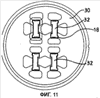 Конструкция, представленная на фигурах 10 и 11, отличается от конструкций, описанных выше и показанных на предыдущих фигурах, тем, что предназначена для использования при экструзии полых деталей. Матрица содержит охватывающий участок 30, который образует множество очков. В образовании каждого очка участвует охватываемый участок 32. Области, образованные между охватывающим участком 30 и охватываемым участком 32, являются полостями 18 матрицы. Каждая полость 18 матрицы представляет собой полость с нулевым рабочим пояском и имеет передние кромки 18а, образованные охватывающим участком 30 и охватываемым участком 32. При использовании матрицы охватываемый участок 32 отклоняется относительно охватывающего участка 30, в который входит другой участок, как описано выше. Такое отклонение в типичной конструкции привело бы к рассовмещению передних кромок 18а, 18b. В соответствии же с настоящим изобретением матрица спроектирована так, что при неиспользовании матрицы передние кромки 18а, образованные охватываемым участком 32, располагаются со смещением по отношению к передним кромкам, образованным охватывающим участком 30 в направлении экструзии, причем при использовании матрицы отклонение охватываемого участка 32 приводит к уменьшению смещения передних кромок 18а, 18b и снижает, таким образом, вероятность получения эллиптического поперечного сечения, например, при экструзии детали с круглым поперечным сечением. В предпочтительном варианте смещение передних кромок 18а, 18b в направлении экструзии при использовании матрицы уменьшается до нуля, однако в некоторых случаях приемлемым является уменьшение смещения до очень малого значения.