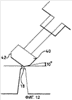 После определения вероятного отклонения вокруг полости матрицы выполняют углубления определенной формы. Контроль, в частности, глубины этих углублений в процессе формирования должен гарантировать точное совмещение передних кромок в состоянии отклонения. Формирование углублений, как правило, осуществляют с помощью шлифования. На фигуре 12 изображен шлифовальный круг 40, имеющий рабочую поверхность 42 в форме усеченного конуса. Шлифовальный круг 40 установлен с возможностью вращения вокруг оси, расположенной под углом к предполагаемому направлению экструзии с целью формирования углубления, основание которого наклонено под углом 10° к передней поверхности матрицы. Зубчатое колесо 40 обычно имеет диаметр приблизительно 15 мм.