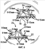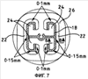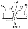 Величины отклонений участков в виде шипов и, следовательно, величины смещений передних кромок полости при неиспользовании матрицы очень малы. На фигуре 6 изображена матрица, имеющая сформированные в ней четыре полости 18, каждая из которых имеет несколько участков 24 в виде шипов и соответствующих им охватывающих участков 26. Фигура 7 представляет собой изображение одной из полостей 18, представленных на фигуре 6, в увеличенном виде. Заштрихованный участок на фигуре 7 соответствует полости 18 матрицы. Вокруг полости 18 сформировано углубление 22, так что передние кромки 18а частей полости, образованные участками 24 в виде шипов, лежат в одной плоскости, а передние кромки 18b, образованные охватывающими участками 26, лежат вне этой плоскости. Углубление 22 сформировано только на охватывающих участках 26 и имеет неравномерную глубину. Размер углубления 22 в различных местах указан на чертеже. Далее, углубление 22 имеет неплоскую донную поверхность. Этой донной поверхности, как показано на фигуре 8, придана наклонная форма.