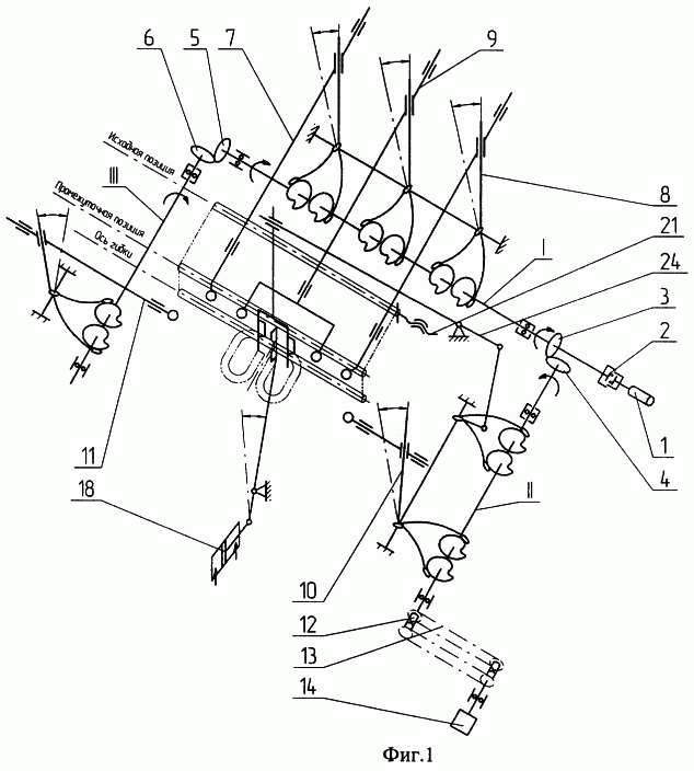 На главном валу I жестко закреплены три двухпрофильных кулачка привода: роликов 7, 8 гибки концевых участков l1=c+e (см. фиг.5) предварительного контура, а также роликов 9 окончательной гибки.
