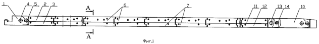 Головка затравки 1 соединена с передним переходным звеном гибкой затравки, состоящим из верхнего переходного полузвена 2 и нижнего переходного полузвена 3 посредством осей 4 и 5. Переднее переходное звено соединено со звеном гибкой затраки, состоящим из верхнего полузвена 6 и нижнего полузвена 7 с помощью упругой стальной ленты 8, которую они охватывают. Верхние 6 и нижние 7 полузвенья гибкой затравки, а также верхние 2 и нижние 3 переходные полузвенья соединены между собой и с упругой стальной лентой при помощи болтов 9. Хвостовик 10 гибкой затравки соединен с задним переходным звеном, состоящим из верхнего переходного полузвена 11 и нижнего переходного полузвена 12, посредством осей 13 и 14. Верхние и нижние полузвенья заднего переходного звена скреплены между собой так же, как и все остальные полузвенья затравки.