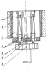1. Устройство для получения отливок с направленной и монокристаллической структурой, включающее зону нагрева, содержащую нагреватель с расположенным в нем блоком, состоящим из нескольких керамических форм с расплавом, теплоизолирующий экран, разделяющий зону нагрева и зону охлаждения, включающую подвижный водоохлаждаемый холодильник, отличающееся тем, что устройство дополнительно снабжено неподвижным водоохлаждаемым холодильником, установленным под теплоизолирующим экраном, а в теплоизолирующем экране и в неподвижном холодильнике выполнены отверстия, соосно расположенные друг другу и каждой керамической литейной форме блока.