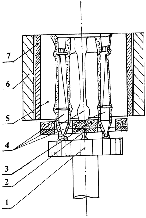 Блок литейных форм 4 в зоне нагрева 5 установлен на подвижный водоохлаждаемый холодильник 1. После нагрева блока форм до температуры 1500-1520°С в литейный блок заливается расплавленный металл из отдельной плавильной печи (на чертеже не показана). Перемещение блока литейных форм из зоны нагрева 5 в зону охлаждения через отверстия, выполненные в теплоизолирующем экране 3 и через неподвижный водоохлаждаемый холодильник 2 с соосно выполненными отверстиями, создает в установке такого типа достаточно высокий градиент 7-8° С/мм. Это достигается прежде всего за счет улучшенной изоляции зоны нагрева от зоны охлаждения и дополнительного неподвижного холодильника 2. Теплоизолирующий экран 3 выполняется обычно из прессованного волокнистого графитового материала. Неподвижный водоохлаждаемый экран 2 выполнен из меди аналогично материалу подвижного водоохлаждаемого холодильника.