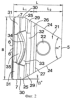 В представленном на чертежах варианте, являющемся опытным образцом, режущая пластина имеет ширину В 40 мм и длину L 31,5 мм, длину L1 фронтальной части около 12,5 мм, т.е. примерно 40% от общей длины L. Далее, толщина Т фронтальной части составляет 12,7 мм, а задняя часть 21 имеет толщину Т2 9,5 мм. Таким образом, хотя фронтальная часть короче и толще, чем задняя часть, она имеет несмотря на это достаточно большую протяженность L1 (на практике 10 – 15 мм). Это означает, что конструктору дается большая степень свободы формирования режущей пластины с эффективной геометрией ломания стружки для различных условий обработки. В показанном предпочтительном варианте стружколом, обозначенный позицией 9, выполнен с наивысшим уступом 29, расположенным на максимальном расстоянии от режущей кромки, более того – в непосредственной близости от наклонной переходной поверхности 26. Разность по высоте между этим уступом 29 и режущей кромкой 6, которая на фиг.3 обозначена буквой N, может значительно изменяться в зависимости от других размеров режущей пластины (которые зависят от области применения режущей пластины), но должна быть в диапазоне 0,3-3 мм. Перед уступом 29 расположена поверхность скольжения 30, наклонная вперед и вниз, которая в свою очередь переходит в канавку 31, имеющую поперечное сечение в виде дуги и прилегающую непосредственно к режущей кромке 6. Каждый элемент стружки, отделяемый от заготовки режущей кромкой 6, проходит канавку 31, имеющую поперечное сечение в виде дуги, и затем наклонную поверхность скольжения 30, чтобы в конце покинуть режущую пластину в зоне уступа 29, имеющего наибольшую высоту.