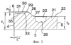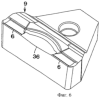 Выборка 22 для носка 15 прихвата по отношению ко всей режущей пластине открыта только вверх и заканчивается дном 28, расположенным на уровне выше основания 3 режущей пластины. Таким образом, ниже выборки сохраняется значительное количество материала. Это обеспечивает режущей пластине максимальную прочность и минимальную чувствительность к разрушению. Хотя возможно выполнить выборку с глубиной до 70% толщины Т2, предпочтительно ее глубина не превышает 50% толщины Т2. В других отношениях следует отметить, что выборка 22 расположена на большом расстоянии от поверхности заднего конца 5 режущей пластины. Более точно, выборка расположена в непосредственной близости от закругленной поверхности 27, примыкающей к наклонной переходной поверхности 26, Выборка 22, имеющая наиболее выгодную форму в виде тела вращения и расширяющаяся кверху путем придания ей определенной конусности, расположена посередине между двумя наклонными боковыми поверхностями 24. Следует также отметить, что наиболее выгодная форма, но не обязательная, верхней поверхности 23 задней части 21 – плоскость.