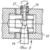 Устройство соединения модулей состоит из модулей: базового 1 и присоединяемого 2. В модуле 1 выполнена посадочная поверхность 3 с торцем 4, а в модуле 2 – хвостовик 5 с торцем 6. За счет выточки 7 хвостовик 5 имеет длину большую, чем расстояние от торца 6 до собственного торца 8. Хвостовик 5 выполнен полый, с резьбовым отверстием 9 для установки упора 10 с наклонной плоскостью 11 с целью разборки модулей 1 и 2. В хвостовике 5 имеются два конусных отверстия – поверхности 12 и 13, выполненные для точности одним инструментом, на расстоянии Н от торца 6 и два паза 14 и 15 по конусным поверхностям 12 и 13 соответственно. Причем ширины пазов 14, 15 от торца 8 до поверхностей 12 и 13 могут быть разными, шириной “b” и “а” соответственно. Ширина пазов 14, 15 от поверхностей 12, 13 до выточки 7 может быть одинаковой и минимальной, а длина L больше, чем длина хвостовика 5. Это необходимо для надежного создания натяга в сопряжении: поверхность 3 – хвостовик 5. С этой целью устройство содержит винт 16 с конусами 17 и 18, также как и конусные поверхности 12, 13, выполненные заодно и жестко связанные посредством стержня 19 диаметром d2 с винтом 16. На конце винта 16 имеется направляющая 20 диаметром d1, причем d21 от торца 4. На конусе 18 выполнен обратный конус 23, взаимодействующий с наклонной плоскостью 11. Для снижения трения при соединении модулей 1 и 2 винт 16 может быть выполнен в виде не вращающейся тяги 24 с теми же конусами 17, 18 и плоским стержнем 25, а направляющая 20 – в виде резьбового элемента 26, с которым сопряжена вращающаяся гайка 27 (фиг.10).,>