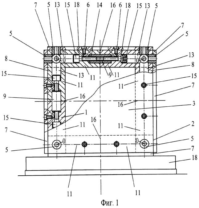 Многоместное приспособление – спутник собирается и работает следующим образом. Приспособление – спутник применяют для многоместного базирования и крепления обрабатываемых деталей со стороны граней рамы 1 на сменных плитах 7. Обрабатываемые детали, элементы базирования и крепления их на плитах 7 на чертежах условно не показаны. Приспособление – спутник может установлено на рабочей позиции 18, фиг.1, например, агрегатного станка, автоматической линии, гибкой производственной системы. Рама 1 собрана из крестовин 8. Крестовины 8 взаимно установлены и соединены между собой устройствами базирования и крепления 9, образуя корпус рамы 1 призматической формы с боковыми ребрами 2, боковыми гранями, окнами 3 и внутренней полостью 4. На боковых гранях с различных сторон рамы 1 базируют плиты 7 с применением базирующих втулок 5 и закрепляют их винтами 6 на раме 1. Крестовины своими выступами 11 пространственно ориентированы и базируются установочными пальцами 14, затем стягиваются винтами 15 устройства базирования и крепления 9. Устройство базирования и крепления 9, включая установочный палец 14 и винты 15 размещены внутри соосно расположенных ступенчатых отверстий 13 каждой пары выступов 11 соединяемых крестовин 8. При этом трехпалые крестовины 8 взаимно соединены своими выступами 11 в трех взаимно перпендикулярных направлениях, базируясь относительно друг друга по скользящей посадке на установочных пальцах 14 и стянуты между собой винтами 15. Пальцы 14 размещают в месте 16 стыка выступов 11. При жестком соединении крестовин 8 выступы 11 состыкованы с прилеганием опорных торцов 12. Для варианта с плавающими крестовинами 8, фиг.7, между опорными торцами 12 выступов 11 дополнительно размещают на установочных пальцах 14 устройств базирования и крепления 9 цилиндрические пружины 17 в качестве упругих элементов с возможностью обеспечения скольжения крестовин 8 в осевом направлении относительно установочных пальцев 14. Для соединения крестовин 8 применяют два варианта исполнения ступенчатых отверстий 13 в выступах 11 и размещения в них устройств базирования и крепления 9. По первому варианту применяют крестовины 8 с одноступенчатыми отверстиями 13 в выступах 11, которые имеют две части изменения диаметров: 131, 132, фиг.4. По первому варианту каждый установочный палец 14 расположен в двух соосных отверстиях диаметров 132 выступов 11 соединяемых крестовин, фиг.6. По второму варианту применяют крестовины 8 с двухступенчатыми отверстиями 13, которые имеют три части изменения диаметров: 131, 132, 133, фиг.5. Установочные пальцы 14 расположены в соосных отверстиях диаметров 133, фиг.1. При соединении крестовин 8 их стягивают винтами 15 с прилеганием в упор головки каждого винта 15 к торцу 18 ступени изменения отверстия 131 от диаметра 132 к диаметру 132.