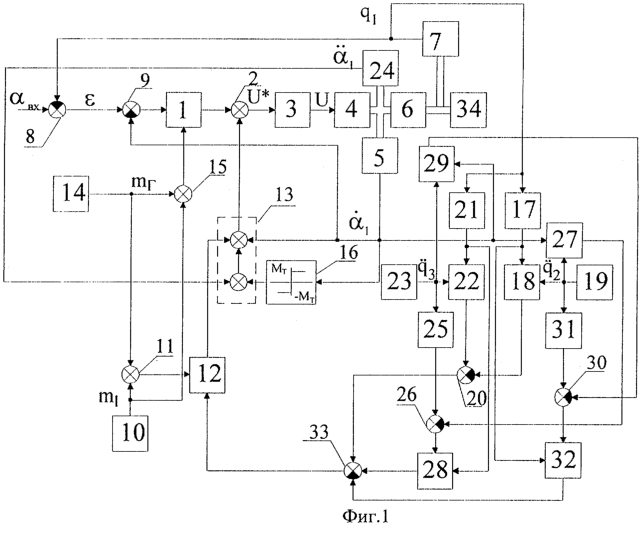 Первый (со стороны датчика 14) и второй положительные входы сумматора 15 имеют коэффициенты усиления соответственно, где JH – номинальное (желаемое) значение приведенного момента инерции, обеспечивающее приводу поворота заданные динамические свойства и качественные показатели. Причем на выходе задатчика 10 формируется сигнал, равный JS+JN+Jip 2+m1l2.