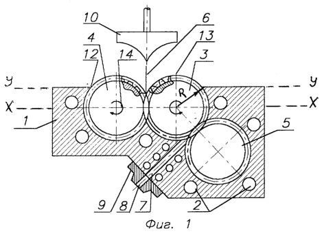 Устройство состоит из корпуса 1, снабженного нагревателями 2, размещенными в стенке корпуса. В полости корпуса расположен рабочий органов в виде системы из зацепляющихся зубчатых валков 3, 4, 5 находящихся в нормальном эвольвентном зацеплении друг с другом, причем валки 3 и 4 являются загрузочными. Данная конфигурация загрузочной зоны 6 позволяет, в отличие от предыдущих установок, перерабатывать крупногабаритные отходы и пленки, причем в области переработки вторичного сырья эта необходимость возникает часто. Направление вращения показано на фиг.1 стрелками. Рабочий орган содержит приводной зубчатый валок 3, входящий в зацепление одновременно с двумя другими рядом расположенными зубчатыми валками 4, 5. Зубчатые валки 4, 5 могут быть свободно размещены в полости корпуса и выполнены без подшипниковых опор, а опорами вращения этих валков, в этом случае, служат внутренние стенки корпуса. Загрузочная зона 6 расположена над зоной зацепления горизонтально расположенных зубчатых валков 3, 4. Валок 5 расположен со смещением вниз. Выходной канал 7 сообщается с формующими каналами 8 формующей головки 9. Устройство также может быть снабжено толкателем 10. Показанное на фиг.1 устройство предназначено, преимущественно, для переработки пленок любой толщины, а также для крупногабаритных отходов без стадии дробления. При переработке сыпучих материалов, для удобства их загрузки, корпус этого устройства может иметь съемную часть 11 (см. фиг.2) с направляющими щеками, при этом расстояние поверхности, проходящей через ребра 12 корпуса 1 от плоскости симметрии зубчатых валков меньше радиуса валков 3 и 4.