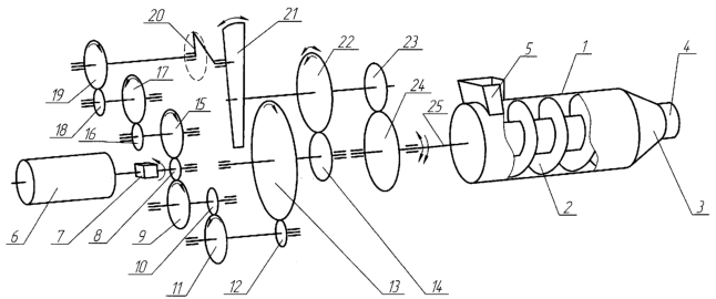 Привод нагнетательного шнека 2 имеет двигатель 6, регулятор частоты 7 (вариатор) и разветвленную кинематическую цепь, одна ветвь которой состоит из ряда зубчатых колес 8, 9, 10, 11, 12, 13, 14, установленных с возможностью создания равномерного вращательного движения, а вторая состоит из зубчатых колес 8, 15, 16, 17, 18, 19, шатунно кривошипного механизма 20 и подводки 21, установленных с возможностью создания крутильных крутильных колебаний высокой частоты. В подводке 21 в подшипнике консольно укреплен вал колес 22 и 23. А на выходном валу 25 нагнетательного шнека экструдера закреплено колесо 24.