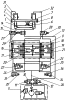 При обратном ходе одновременно с возвратом подвижной траверсы 2 в исходное положение осуществляется возврат в исходное положение и блока 20 подвижных элементов дозатора. При этом для заполнения полостей цилиндров дозатора используется жидкость, вытесняемая из полостей силовых цилиндров 3, что обеспечивает синхронную работу возвратных цилиндров 4. Возвратный ход начинается с включения электромагнита 12. Реверсивный золотник 10 занимает позицию, при которой трубопровод 26 соединяется со сливом, а трубопровод 13 – с напорной магистралью. На первом этапе возвратного хода дополнительно к электромагниту 12 включаются электромагниты 24, 25, 29 и 30. При этом золотники 22, 23, 27 и 28 меняют позиции: золотники 22 и 23 соединяют полости дозирующих цилиндров 18 и 19 низкого давления с трубопроводом 26, а золотники 27 и 28 – полости дозирующих цилиндров 16 и 17 высокого давления с трубопроводами 31 и 32 и силовыми цилиндрами. При таком положении золотников жидкость от насосной станции поступает в возвратные цилиндры, подвижная траверса 2 движется вверх, а жидкость, вытесняемая из силовых цилиндров, заполняет полости дозирующих цилиндров высокого давления. Блок 20 подвижных элементов дозатора движется вправо (см. фиг.) и вытесняет жидкость из полостей дозирующих цилиндров низкого давления на слив через реверсивный золотник. Данное перемещение блока подвижных элементов дозатора соответствует режиму зарядки мультипликатора-дозатора (в дозатор возвращаются объемы жидкости, вытесненные из него в силовые цилиндры при рабочем ходе). После перемещения блока подвижных элементов дозатора вправо (см. чертеж) на расчетную величину происходит отключение электромагнитов 24, 25, 29 и 30 и золотники 22, 23, 27 и 28 занимают исходные позиции. Золотники 22 и 23 соединяют полости дозирующих цилиндров 16 и 17 высокого давления через реверсивный золотник и трубопровод 26 со сливом, золотники 27 и 28 – силовые цилиндры с полостями дозирующих цилиндров 18 и 19 низкого давления. При этом подвижная траверса продолжает движение вверх, а жидкость из силовых цилиндров вытесняется в полости дозирующих цилиндров 18 и 19 низкого давления. Блок 20 подвижных элементов дозатора движется влево и вытесняет жидкость из полостей дозирующих цилиндров 16 и 17 высокого давления на слив через реверсивный золотник. Данное перемещение блока подвижных элементов дозатора соответствует режиму зарядки редуктора-мультипликатора (в дозатор возвращаются объемы жидкости, вытесненные из него в силовые цилиндры при холостом ходе) и продолжается оно до выхода подвижной траверсы пресса в исходное положение. В идеальном варианте к этому моменту в исходное положение должен выйти и блок подвижных элементов дозатора, что соответствует началу нового рабочего цикла пресса. Однако вследствие возможных утечек жидкости из замкнутых объемов (силовой цилиндр – дозирующий цилиндр), вследствие разброса параметров обрабатываемых на прессе заготовок и др. наиболее вероятным будет то, что в момент выхода подвижной траверсы пресса в исходное положение блок подвижных элементов дозатора будет занимать позицию слева или справа (по схеме) от исходного положения. В этом случае до начала нового рабочего цикла пресса осуществляется корректировка положения блока подвижных элементов дозатора. При этом отключается электромагнит 12 и включ