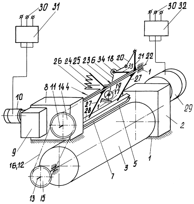 Электропривод 10 в редукторе 9 механизма 4 резки и привод 2 мотор-редуктора 29 для привода барабана 3 электрически соединены с сетью питания 30 посредством индивидуальных частотных преобразователей 31 и 32.
