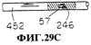 На Фиг.29А-29В показаны изометрия и вид сбоку, соответственно, следующего предпочтительного варианта каркаса 450 скоросшивателя согласно настоящему изобретению. На Фиг.29С показано боковое сечение стержня 452 каркаса 450. Каркас 450 содержит три кольца 246 и стержень 452. На Фиг.29С показано, что кольца 246 содержат сегменты 24 6А колец и сегменты 246В колец, концы которых имеют петли 47 и щели 48, соответственно. Также утолщения 49А и 49В выступают из сегментов 246А и 246В колец, соответственно. Сегменты 246А колец имеют маленькое отверстие на конце, в которое могут быть вставлены петли 47. Каркас 450 собран путем введения сегментов 246А колец через отверстия 57, имеющиеся в каркасе 450, и смещением колец 246 так, что только утолщения 49А, а не утолщения 49В могли бы пройти через отверстие 57 в форме электрической лампочки. Затем каждое кольцо 246 вращается вокруг части кольца 246, расположенного в отверстии 57, чтобы поставить кольца 246 вертикально относительно стержня 452, как показано на Фиг.29А.