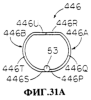На Фиг.31А изображен вид снизу еще на один предпочтительный вариант части кольца 446 согласно настоящему изобретению, а на Фиг.31В-31F показаны виды снизу на скоросшиватель 1, изображенный на Фиг.1А-1L, с каркасом 50, включающим кольца 446 вместо колец 46. На Фиг.31В-31F показаны кольца 446 в различных положениях, по мере того, как разное число передних сшитых листов 72А перевернуто под заднюю обложку 40. Кольца 446 содержат сегменты 446А-446В колец, а части стержня 53 пересекаются сегментами 446А-446В. Сегмент 446А кольца содержит сегменты 446P-446R кольца, а сегмент 446B кольца содержит сегменты 446S-446U кольца. Форма кольца 446 является усеченным эллипсом аналогично кольцу 346 с добавленными хордовыми сегментами 446Р и 446S кольца параллельными большой оси эллипса колец 446. Когда скоросшиватель 1 на Фиг.31А-31F открыт на 180 градусов, средняя обложка 42 давит на плоские сегменты 446Р и 446S кольца, заставляя кольца 446 занять вертикальное положение.