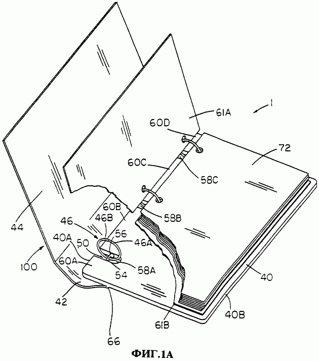 27. Скоросшиватель по п.19, отличающийся тем, что дополнительно содержит стержень, который прикрепляется к каждому из колец скоросшивателя, причем обложка имеет среднюю обложку, задняя обложка имеет по меньшей мере одно отверстие в обложке вблизи первого края задней обложки, а по меньшей мере одно из колец скоросшивателя продето через отверстие в обложке для скрепления с возможностью открепления обложку кольцом; задняя обложка также имеет второй край, по существу параллельный первому краю; средняя обложка соединена с задней обложкой между отверстием обложки и вторым краем.