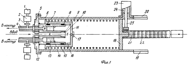 В штоке 21 просверлены сквозные отверстия 22, против этих отверстий с одной стороны светодиоды 20, а с противоположной – фотодиоды 19. Отверстия расположены на равных расстояниях между собой. Сочетание светодиод – отверстие – фотодиод обеспечивает возможность ЭВМ управлять движением и остановкой поршня 18.