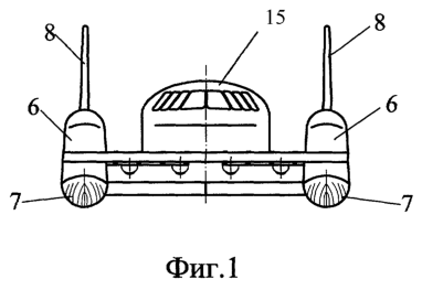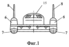 Заявляемое ТС представляет собой прямоугольную в плане платформу-крыло 1 с закрылком 2 в кормовой части. Платформа имеет удлинение ( , где b и l – соответственно ширина и длина платформы), равное 0,3-0,4, обеспечиващее получение максимальной относительной подъемной силы поддува ( , где Y – подъемная сила, Р – тяга поддувных двигателей) при минимальных затратах мощности поддувных двигателей. Для осуществления балансировки аппарата при различных эксплуатационных массах и центровках ТС с минимальными энергетическими затратами на нижней поверхности платформы 1 установлен щиток 3, ось вращения 4 которого расположена от носовой кромки 5 платформы на расстоянии не более 0,7 ее длины. По торцам платформы параллельно ее продольной оси установлены объемные скеги 6 с эластичными пневмобаллонами 7 в нижней части каждого скега. Для обеспечения устойчивости на курсе в кормовой части каждого скега установлено вертикальное оперение 8. В носовой части каждого скега расположены поддувные газотурбинные (турбовентиляторные) двигатели 9 с газовыхлопным устройством 10 в виде трубчатой конструкции, направленным в сторону носовой оконечности ТС. Передняя часть 11 газовыхлопного устройства выполнена параллельно носовой кромке платформы, оборудована отклоняющимися в вертикальной плоскости соплами 12 и закреплена на балке-пилоне 13, опирающейся на носовые части скегов левого и правого борта. Для обеспечения максимального значения относительной подъемной силы поддува на платформе-крыле в сочетании с оптимальным положением центра давления этих сил срез 14 сопел 12, расположен впереди носовой кромки платформы на расстоянии не менее 0,15 длины платформы. На верхней поверхности платформы в ее диаметральной части установлена ходовая рубка 15. В кормовой части скегов расположены газотурбинные (турбовентиляторные) двигатели 16, газовыхлопные устройства которых оборудованы соплами 17, установленными с возможностью их поворота в горизонтальной плоскости для обеспечения маневрирования ТС по курсу на различных режимах его движения.