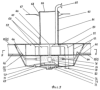 Днище центральной пирамиды-поплавка любой понтонной фигуры выполнено с уклоном 3-5° к сточному колодцу 69, размещенному по ее вертикальной оси. Таким же путем в центре нижнего яруса центральной пирамиды-поплавка любой понтонной фигуры установлена цилиндрическая полая опора 70. Она разделена перегородкой 71 на верхнюю герметичную и нижнюю водопроницаемую полости. В верхней полости размещен электроприводной центробежный осушительный насос 72, соединенный своей всасывающей полостью (не показана) с приемником 73 сточного колодца 69, а нагнетательными трубопроводами 74 и 75 – соответственно с коллектором 76 и отливным кингстоном 77 пирамиды-поплавка. От коллектора 76 отведены лучи-трубопроводы 46, которые по соответствующим межпоплавковым радиальным 10, 10′, межраскосным 12 и раскосным 11 элементам жесткости (фиг.2, 7, 8, 9, 10) подведены к входным полостям (не показаны) рабочей воды эжекторов 41 (фиг.7) угловых 3, 3′ и линейных 7 водоизмещающих фундаментов-поплавков. Верхняя полость цилиндрической опоры 70 (фиг.9) имеет свободное сообщение с выгородкой через лаз 78 (фиг.10) в горизонтальной перегородке 58. В нижней полости опоры 70, боковые поверхности которой перфорированы (не показано), установлен приемный магнитоуправляемый кингстон 79, а в верхней части стенки-грани выгородки 59 установлены электроуправляемые клапаны вентиляции (не показаны).