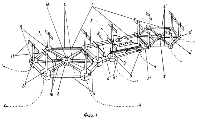 В центре каждой из фигур-понтонов, а у многоугольных фигур еще и симметрично их вышеуказанным угловым фундаментам-поплавкам размещена центральная водоизмещающая пирамида-поплавок 8, 8′, 9 (фиг.1 и 2), аналогичная по форме угловым и линейным водоизмещающим фундаментам-поплавкам. Обращенные друг к другу усеченные борта-грани угловых 3, 3′ и центральных 8, 8′ пирамид-поплавков многоугольных понтонных фигур соединены межпоплавковыми полыми радиальными элементами жесткости в виде элементов 10, а обращенные друг к другу борта-грани линейных фундаментов-поплавков 7 четырехугольной понтонной фигуры соединены между собой межпоплавковыми полыми раскосными элементами жесткости 11. Последние, а также линейная связь 6′ соединены по нормали к ним с обращенными в их сторону бортовыми гранями центральной водоизмещающей пирамиды-поплавка 9 посредством таких же полых межраскосных радиальных элементов 12 жесткости. Диаметры всех межпоплавковых 10, 10′, раскосных 11 и межраскосных 12 полых элементов жесткости, а также диаметры межпоплавковых периметрических и линейных связей многоугольных и четырехугольной понтонных фигур равны между собой и составляют половину высоты водоизмещающей пирамиды-поплавка. Все межпоплавковые полые элементы жесткости 10, 10′ 11, 12 и все межпоплавковые полые периметрические и линейные связи 4, 4′, 5, 5′, 6, 6′ сопряжены посредством фланцев (не показаны) с бортовыми гранями соответствующих пирамид-поплавков в их верхней части.