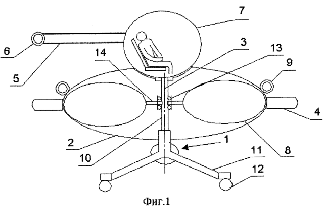 Рама 1 выполнена с тремя штангами 11, на концах которых установлены посадочные опоры 12.