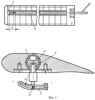 Несущий винт переменного диаметра содержит четыре лопасти, причем одна пара лопастей обычной конструкции соединяется с втулкой винта через осевой, горизонтальный и вертикальный шарниры либо универсальный шарнир и имеет неизменный диаметр. Вторая пара лопастей подвижна относительно радиуса вращения и может перемещаться на расстояние, равное 0.4-0.45 диаметра первой пары лопастей. Подвижная лопасть /фиг.1/ состоит из типового набора нервюр, стрингеров, обшивки, а также лонжерона 1, комля – сплошной части 2. В лонжерон свободно входит штанга 3, которая своим внутренним концом крепится к втулке 11 винта аналогично лонжеронам лопастей неизменного диаметра /через набор шарниров или универсальный шарнир/. В сечении лонжерон и штанга должны иметь профиль, соответствующий требованиям прочности и аэродинамики. Перемещение лонжерона и лопасти от оси вращения ограничивается ползуном 4, который, скользя внутри профиля штанги, упирается в торец сплошной поверхности, выполненной на внешнем конце штанги на длине, соответствующей величине l. Величина l определяет расстояние, на которое штанга входит в лопасть в ее выдвинутом состоянии. Ползун является частью упорно-фиксирующего устройства, закрепляемого на нижней части комля лопасти, причем ползун, нагруженный пружиной, входит во внутреннюю полость штанги через паз в лонжероне и комле лопасти /фиг.3/. Таким образом, съем подвижной лопасти возможен только при принудительном удалении ползуна из внутренних полостей лонжерона и штанги. Упорно-фиксирующее устройство, кроме того, фиксирует подвижную лопасть на минимальном удалении от оси вращения при ее втягивании. Для этого в нижней части внутренней поверхности штанг ближе к оси вращения имеются выступы-упоры 17 со скошенным внешним торцем. Эти упоры определяют минимальное расстояние подвижных лопастей до оси вращения, что соответствует минимальному диаметру несущего винта. Нижняя часть ползуна снабжается пальцем 6, поверхность которого заканчивается конусом. Палец при втянутых лопастях входит в фигурный паз планки 5, прикрепленной посредством кронштейна к втулке винта. В планке устанавливается электрозамыкатель со штоком 16. Электрозамыкатель включен в цепь электропитания электромагнитного клапана тормозной гидросистемы. Подвод и съем электропитания осуществляется через контактно-щеточный узел, монтируемый на нижней поверхности втулки винта. Подвижная лопасть через амортизатор 7 связана с тянущим тросом 8, другой конец которого закрепляется на барабане 10. Барабан свободно вращается на валу 12. Полый опорный вал жестко крепится к набору фюзеляжа ЛА, а на валу на опорно-упорных подшипниках вращается втулка 11 с лопастями несущего винта. Внутри вала проходит шток 13, жестко связанный с тормозным диском 9, а другой конец штока связан с поршнями цилиндров гидропривода 14. В нерабочем состоянии тормозной системы между диском и барабаном выдерживается зазор /благодаря пружинам внутри цилиндров/. Под втулкой помещается механизм изменения угла атаки лопастей 15, изменяющий либо общий шаг винта – механизм изменения шага /МИШ/, либо также еще и циклический шаг – автомат перекоса /АП/. Работа всего устройства происходит следующим образом. Перед взлетом подвижные /скользящие/ лопасти несущего винта находятся в выдвинутом положении, что соответст