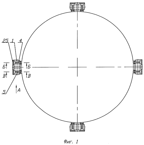 Предлагаемое изобретение поясняется чертежами, где на фиг.1 изображен общий вид устройства, установленного на космическом аппарате, на фиг.2 – вид А, на фиг.3, 4 показаны соответственно разрезы Б-Б, В-В.