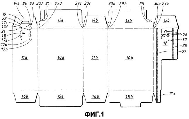 Заготовка, показанная на фиг.1, содержит две пары панелей 10а, 10b и 11а, 11b, образующих стенки складной коробки, а также клеевую створку 12 складной коробки, граничащую со стеночной панелью 10b. Каждая из этих панелей граничит с примыкающими панелями традиционным образом, посредством линий сгиба (показанных пунктирными линиями). Закрывающие створки 15а, 15b и 16а, 16b, и часть 12а клеевой створки складной коробки граничат, в нижней части фиг.1, с соответствующими стеночными панелями и клеевыми створками складной коробки. Эти нижние закрывающие створки складной коробки, показанные на чертеже, имеют традиционное выполнение и далее не будут описываться подробно. Вместе с верхними закрывающими створками 14а, 14b и 13а, 13b, показанными на фиг.1, а также с продолжением 12b клеевой створки, они образуют противоположную пару стенок складной коробки, которые, в соответствии с изложенным выше, не обязательно должны быть верхом и дном.