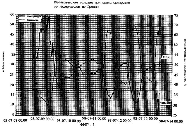 Фиг.1 изображает температуру и. влажность воздуха при транспортировке гигиенических изделий из Голландии В Грецию.