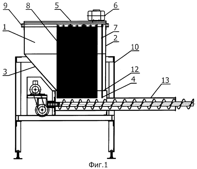 Листы 7 и 8 могут быть выполнены сборными, например, из двух или более полос в каждой из плоскостей, такое их выполнение способствует созданию дополнительных колебаний, тем самым улучшается процесс сводообрушения и заполнения принимающего объема шнекового питателя.