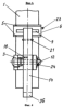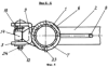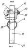 Вертикальный рычаг 1 снабжен упором 23, ограничивающим угол поворота втулки 6 в вырезе 7. Оси 12 и 13 закреплены на кронштейнах 3 и 10 шплинтами 24 и 25. Нижние концы вертикальных пластин 14 и 15 имеют выступы 26 и 27. Для повышения прочности трубы 2 к нижней образующей ее приварено ребро жесткости 28, которое вертикальным торцом приварено к вертикальному рычагу 1.