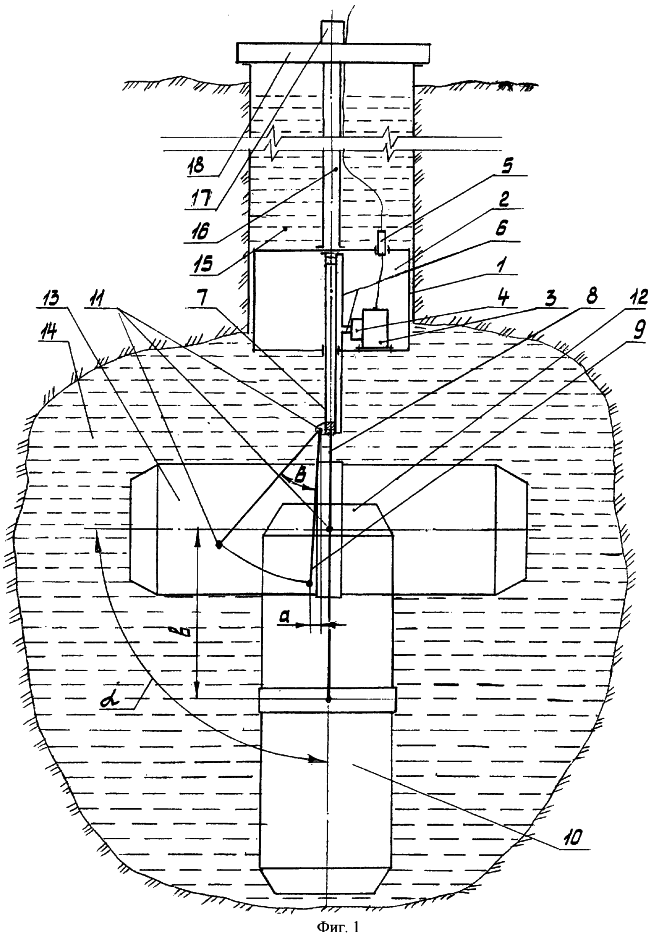 Работа устройства происходит следующим образом. При подаче жидкости гиросистемы герметичного контейнера 2 под поршни гидроцилиндров 7 и ходе штоков 8 вверх на величину “b” водила 9 за счет начального эксцентриситета “а” и далее с его увеличением отклоняются на угол “ “, осуществляя поворот груза на заданный угол “ “.