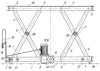 При подъеме грузов на большую высоту представляет интерес передвижной подъемник, содержащий опорную платформу с ходовой частью и рабочую площадку, соединенные между собой шарнирно-рычажным механизмом типа «нюрнбергских ножниц», крайние шарниры рычагов которого связаны звеньями, шарнирно соединенными между собой и образующими две боковые складные лестницы, привод перемещения рычагов шарнирно-рычажного механизма, в котором, с целью повышения его надежности в работе путем увеличения жесткости шарнирно-рычажной системы, он снабжен двумя параллельными плоскости шарнирно-рычажного механизма кронштейнами, жестко соединенными с опорной платформой и выполненными в виде треугольных рам, одна из сторон которых имеет криволинейный паз, причем в этих пазах размещены концы оси центрального нижнего шарнира указанного механизма, снабженные стопорами для фиксации рычагов, шарнирно сочлененные звенья лестниц выполнены в виде жестких рам трапецеидальной формы, шарнирно связанных между собой меньшими основаниями, причем подъемник снабжен трособлочной системой, блоки которой установлены на осях крайних шарниров, соединяющих основания указанных жестких рам, при этом тросы запасованы через блоки и закреплены верхними концами на рабочей площадке, а нижние концы их соединены с натяжным устройством, установленным на опорной платформе (SU, авторское свидетельство №1087459. А. М. кл.3