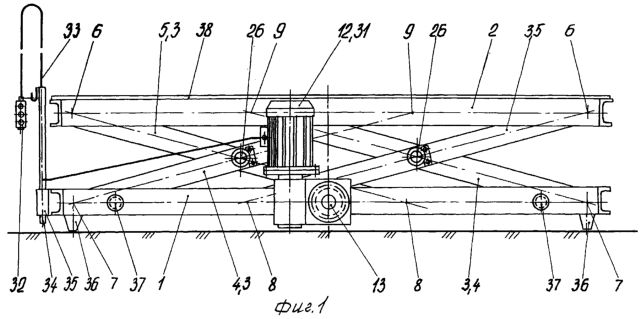 Раздвижной привод 12 выполнен в виде приводного вала 13. Он снабжен звездочками 14, 15, 16 и 17 и связан ветвями 18, 19, 20 и 21 втулочно-роликовых цепей через свободно вращающиеся звездочки 22, 23, 24 и 25 с осями 26 шарнирно соединенных пересекающихся пар рычагов 4 и 5. Свободные концы ветвей втулочно-роликовых цепей соединены с основанием 1 посредством упругих элементов 27, 28, 29 и 30. Упругие элементы 27-30 могут быть выполнены как в виде пружин растяжений, так и пружин сжатия. Геометрические оси свободно вращающихся звездочек 22-25 совмещены с осями нижних концов 7 пересекающихся шарнирно соединенных пар рычагов 4 и 5. Конец приводного вала 13 раздвижного привода 12 кинематически связан с электромеханическим приводом 31, выполненным в виде мотор-редуктора. Последний имеет самотормозящий червячный редуктор. Пульт 32 управления мотор-редуктора привода 31 выполнен переносным и соединен с ним кабелем 33. Пульт 32 управления имеет стойку 34, которая смонтирована в кронштейне 35 основания 1. Описанный механизм обеспечивает высокую надежность подъема платформы 2 на высоту до 2,5 м при грузоподъемности 5 т.
